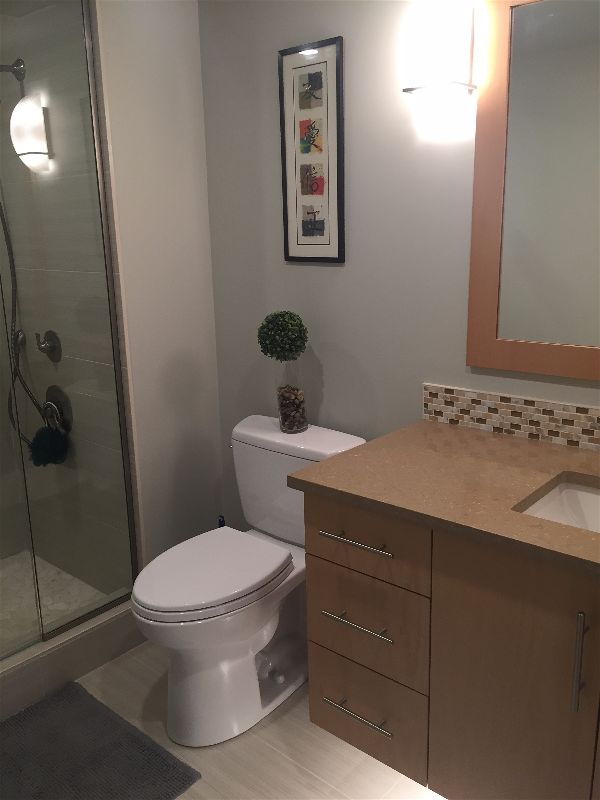 The project included  a kitchen renovation, bathroom renovations for two bathrooms, a main bathroom, and an en suite bathroom. We removed a structural wall inside the condominium, to create an open concept from their kitchen to their living room, and dining room. With beautiful views through their penthouse balcony, removing the wall allowed them to look from the kitchen and see across Halifax Harbour, to the cityscape.