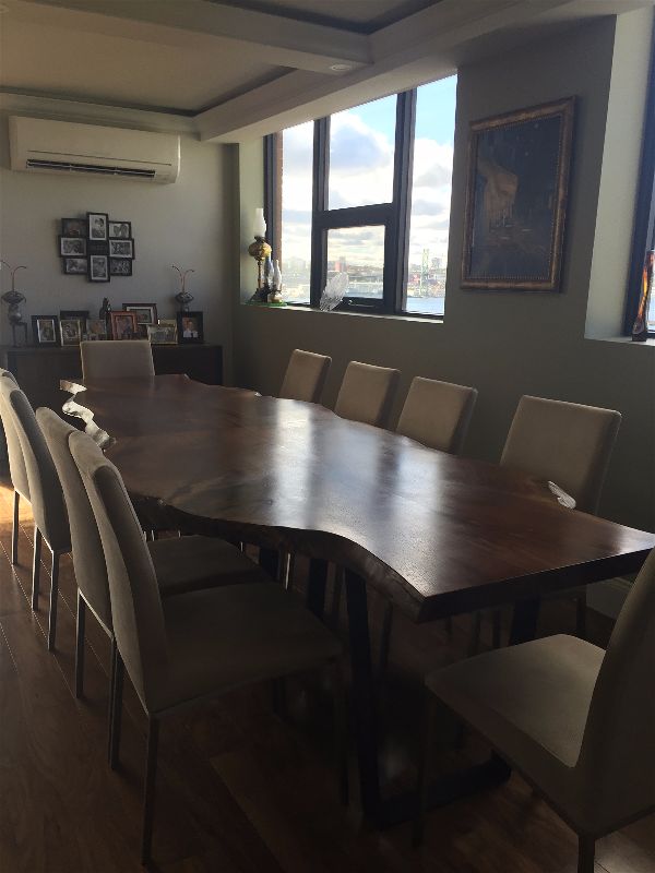A live edge dining room table, well-placed lighting, built-ins, and artwork created the look these Dartmouth homeowners were going for.