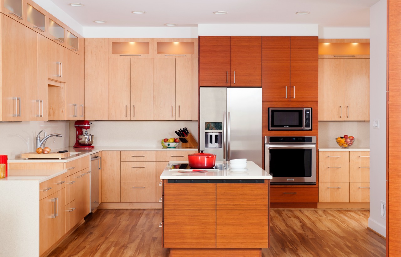 A modern wood grain style kitchen redesign featuring an island with pull up chairs and plenty of nooks for storage