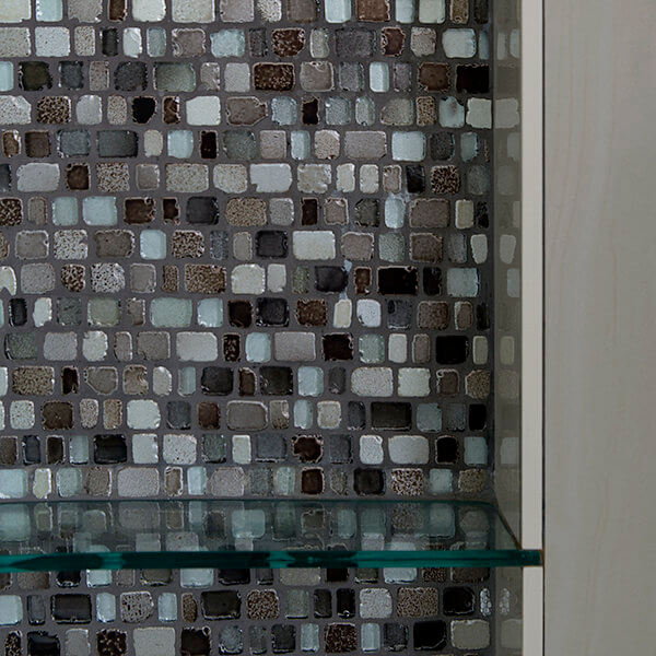 We added some interesting details to the clean and simple ensuite. We created shelving nooks at the end of the shower to make storing linens a design feature. The built-in accent-tiled shower shelves help keep the clutter to a minimum. Modern dual-flush toilets and water-saving shower heads were added to both spaces to help minimize water waste and municipal taxes.