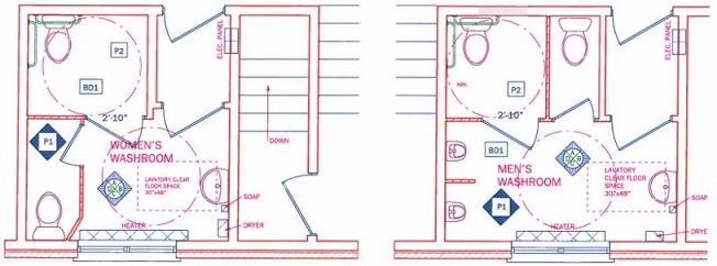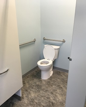 As part of our Case process we coordinate a material selections meeting with our clients. For this project materials such as commercial toilets, sinks, faucets, urinals, and a new commercial grade vinyl tile were selected. As well as, rubber baseboards, partitions, hand dryers, soap dispensers, and wall paint. These selections completed the design process and we were able to begin construction. The on site work included carpentry for wall and floor preparation, plumbing, electrical, and painting.