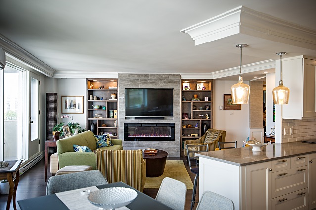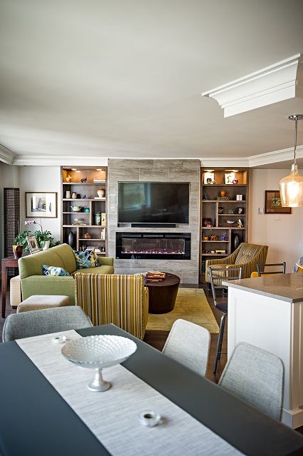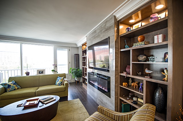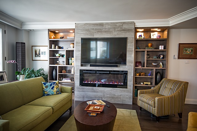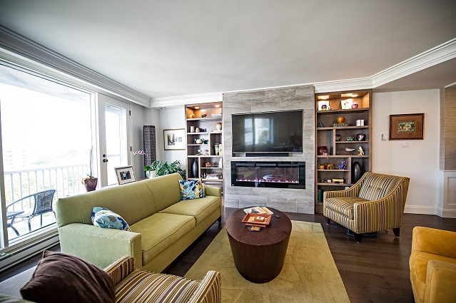 The new living area includes a floor to ceiling fireplace unit with cement board substrate and porcelain tiled finish. We mounted a TV to the wall relocating the original outlets and supplied built in shelving units, as well as a drywall valance over the windows.