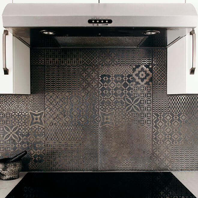 A built in buffet with matching quartz and a custom upholstered bench were added to the dinning room space. The tree-branch chandelier adds a soft sparkle to offset the cleaner modern lines of the kitchen. The cookbook rack on the side of the pantry makes use of an otherwise unused space. The unique charm of this kitchen really comes from the dark, textured tiles, reminiscent of Gaudi’s decorative sidewalks in Barcelona. It was love-at-first-sight for the homeowner, and the rest of the design fell into place from there.
