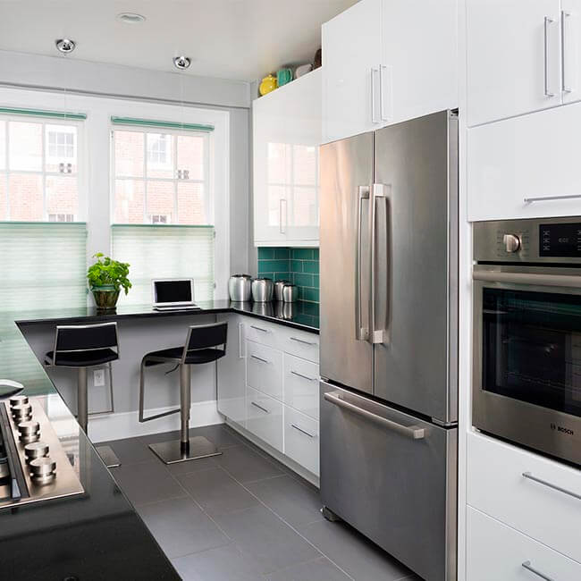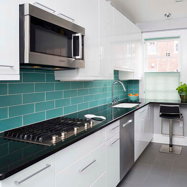 Because the space was narrow, we kept things bright and simple. The large, neutral-grey floor tiles run the length of the kitchen to help make the space feel larger. Sleek white cabinets and bar pull handles keep the visual clutter to a minimum and streamline the space. A sense of balance was given to the space by mixing stainless steel and dark quartz counters, with a fun teal subway tile back splash. This cheery pop of colour keeps the space from feeling too stark and industrial.