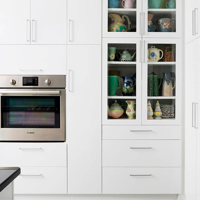 By leaving a section of the cupboards with glass fronts, it created a modern china cabinet for the homeowners to display their special pieces. This also softens the solid white lines and adds an eclectic and nostalgic touch. Across from the new large storage pantry we added a small breakfast bar under the window. The homeowners were definitely excited to see the new space and couldn’t wait to get cooking!
