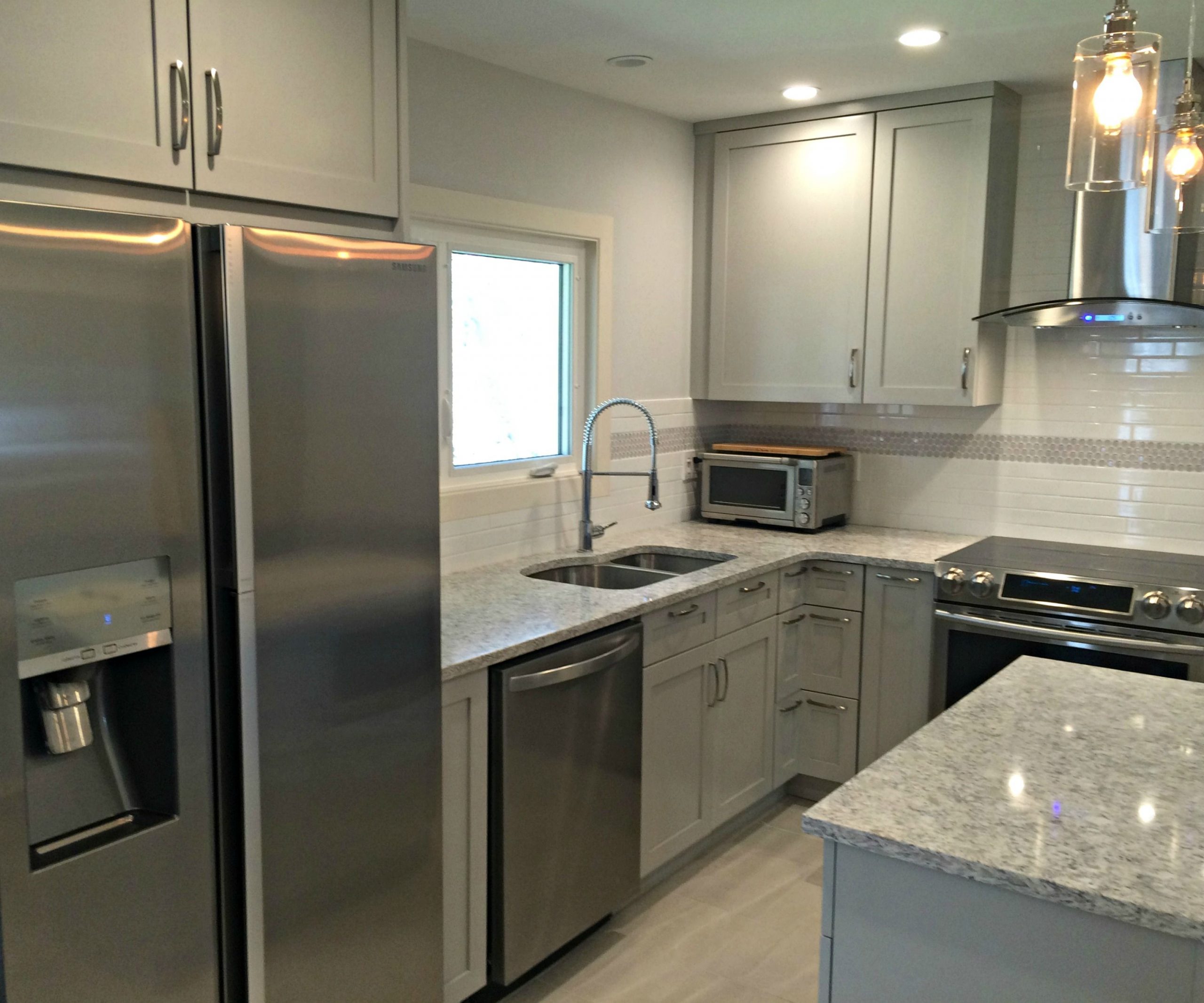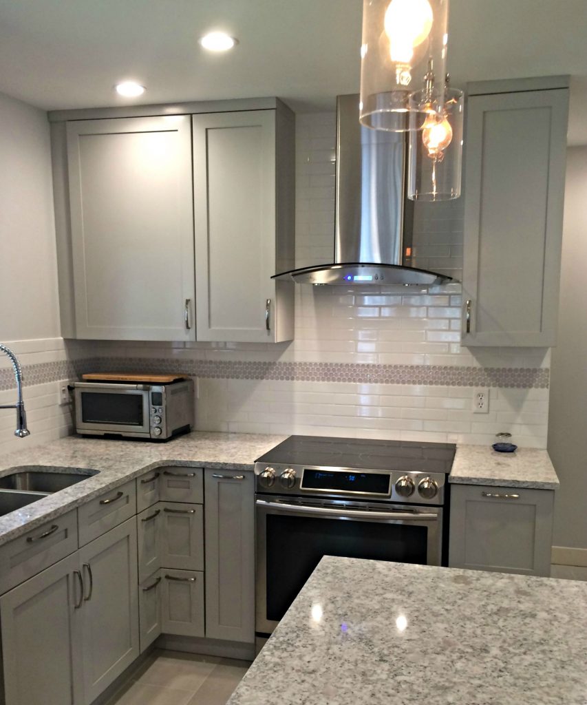 We first meet these clients at a home show and they had mentioned they were looking to have a company provide them with a new kitchen layout designed to better suit their life style and most of all they wanted their space to make sense! Before having Case work on their kitchen remodel; the clients had already purchased their own appliances, which meant we had the challenge to incorporate these features into the new design. Once we took a look at the current layout we believed the best thing to do would be to take out the smaller wall between the side entrance and the kitchen. Then we decided to create a larger opening from the kitchen to dining area. A new window would be installed above the kitchen sink and we would relocat the fridge, microwave and stove with new range hood. These decisions created more space for our design team to work in a custom kitchen island that would provide more storage space and a perfect place to store that new microwave. This remodel included all new cabinetry with shaker style doors in a light grey. In addition to a new cabinet door style; features such as a wall cabinet with built in spice rack, roll out shelves for easy access to pots and pans, left and right tip out trays for spatulas and utensils, and metal pulls provided a more functional way to operate in the kitchen. The contemporary look continued with adding all new crown molding throughout. Brightness was brought to the space with a new floor done in a 12’’ x 24’’ white ceramic tile brick pattern, white ceramic tile backsplash with penny tile accents, new quartz countertop, new under mount stainless steel sink and half, new kitchen faucet and a fresh coat of paint.