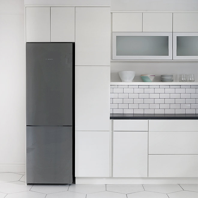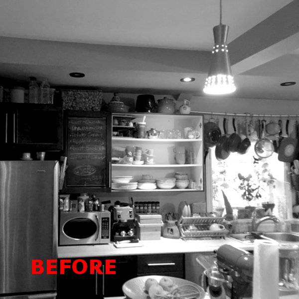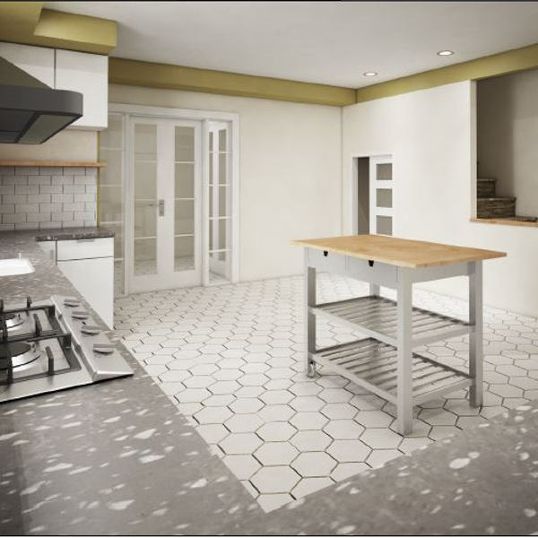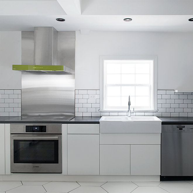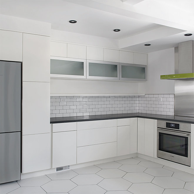 The beautiful and unique 18” hexagon floor tiles set the tone for the dramatic transformation. Simple white cupboards are anchored with simple subway tiles and dark grout lines. Adding open shelves along the perimeter also give them space to display their favourite treasures. The new, energy-efficient, top-of-the-line appliances keep the lines clean and modern. The stainless-steel range hood adds a pop of cheery bright green. Finally, truly unique counter tops are the perfect finishing touch – their subtle tone-on-tone geometric shapes add a playful and fun accent to the space.
